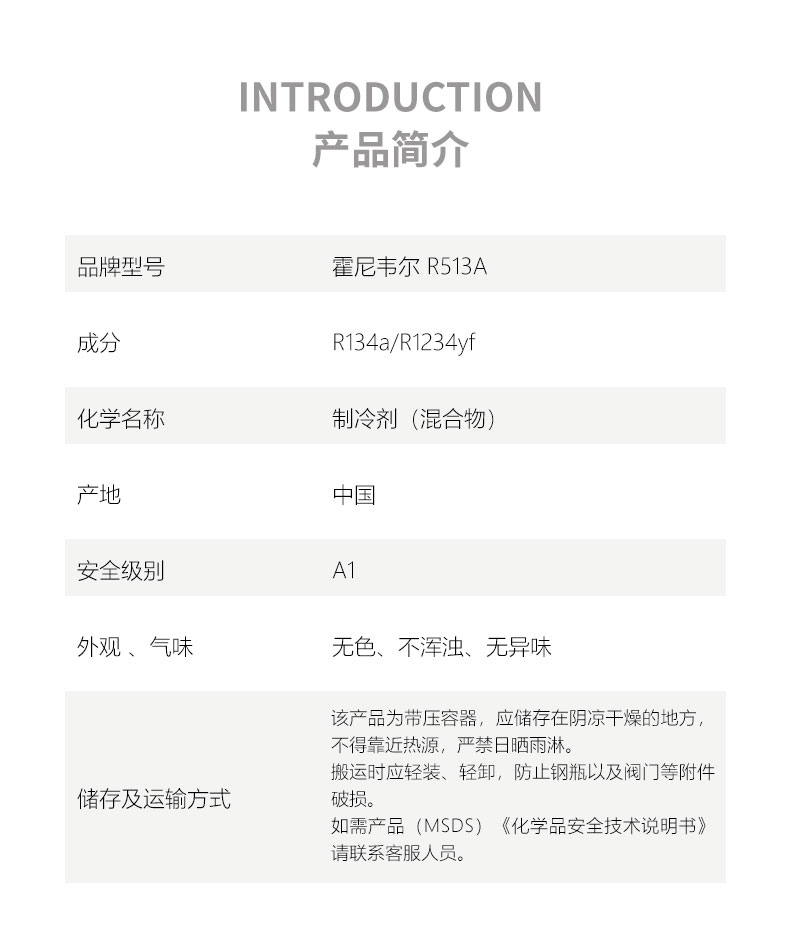 霍尼韋爾R513A制冷劑鋼瓶為帶壓容器,儲(chǔ)存時(shí)應(yīng)遠(yuǎn)離火種、熱源、避免陽(yáng)光直接曝曬,通常儲(chǔ)放于陰涼、干燥和通風(fēng)的倉(cāng)庫(kù)內(nèi);搬運(yùn)時(shí)應(yīng)輕裝、輕卸,防止鋼瓶以及閥門等附件破損。