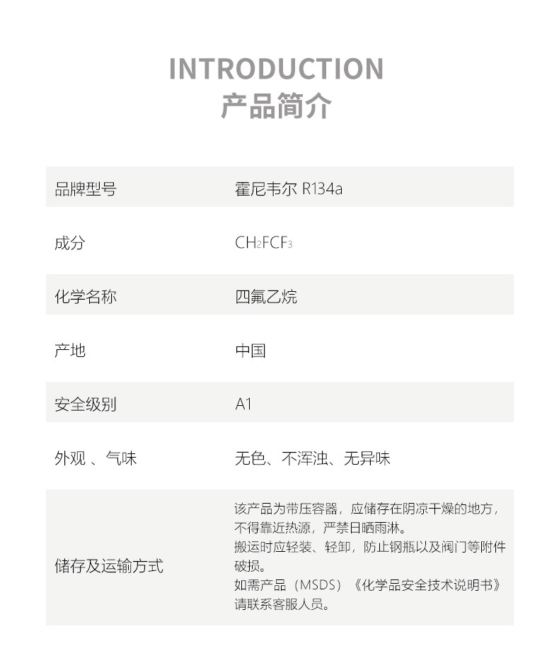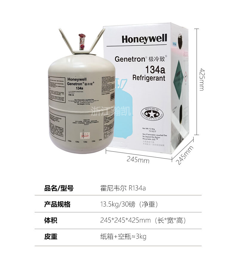 霍尼韋爾R-134a制冷劑,別名R134a、HFC134a、HFC-134a、四氟乙烷,商品名稱為Genetron 134a。由于霍尼韋爾R-134a屬于HFC類物質(非ODS物質Ozone-depleting Substances)——因此完全不破壞臭氧層,是當前絕大多數國家認可并推薦使用的制冷劑,也是環保制冷劑,廣泛用于新制冷空調設備上的初裝和維修過程中的再添加。