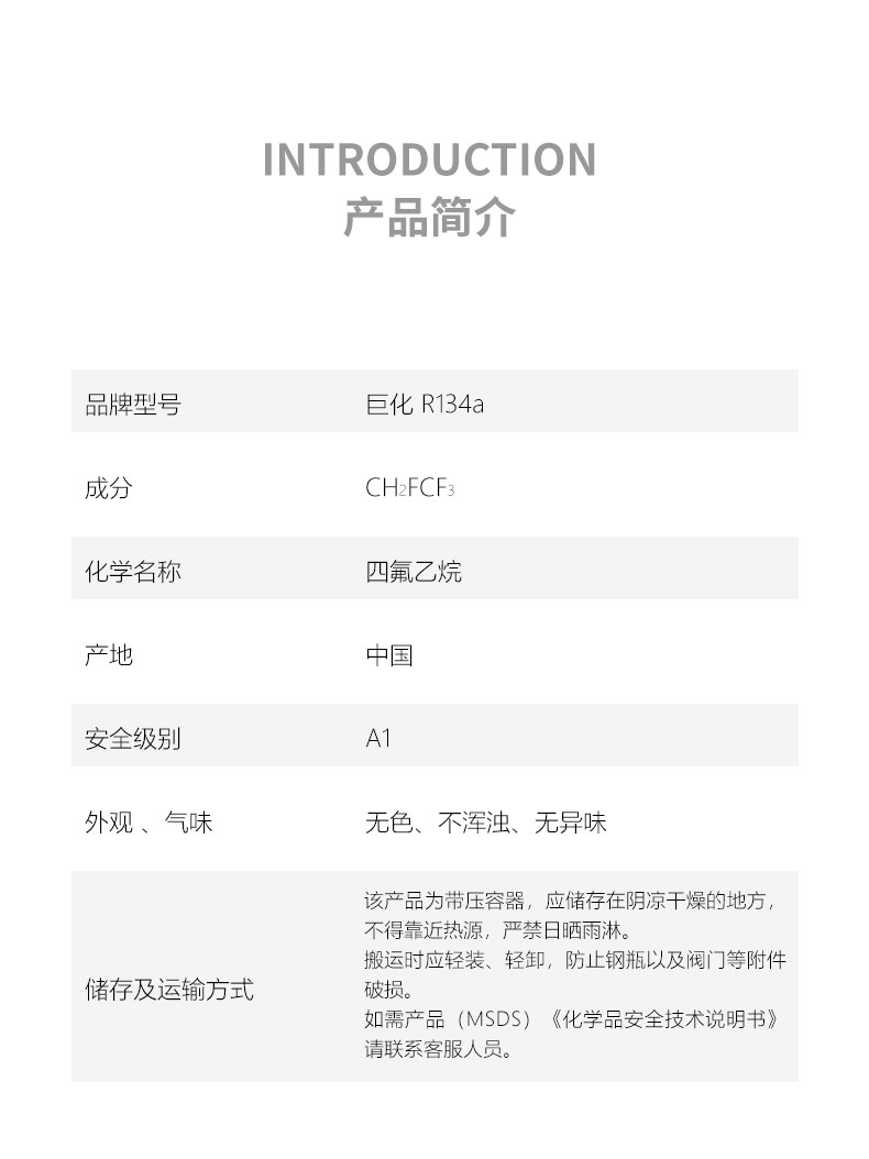 巨化R-134a制冷劑,別名R134a、HFC134a、HFC-134a、四氟乙烷。由于巨化R-134a屬于HFC類物質(zhì)(非ODS物質(zhì)Ozone-depleting Substances)——因此完全不破壞臭氧層,是當(dāng)前絕大多數(shù)國(guó)家認(rèn)可并推薦使用的制冷劑,廣泛用于新制冷空調(diào)設(shè)備上的初裝和維修過(guò)程中的再添加。